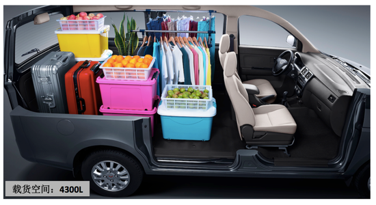 这车能装、能多装、能好装!在最大载货长度、最大载物空间方面,五菱宏光V均为同级别中的佼佼者。其4300L/2500L/500L不同的载货空间,轻松变幻,收放自如,能够很好满足用户多样化的使用需求。在拆除了中后排座椅的情况下,车内的装货空间可达到4300L,如果拉货,可以装30寸行李箱37个,春节年货5L食用油860桶,同时方方正正的车身造型,让内部载货空间没有任何浪费,即使在车上开个杂货铺也没问题。